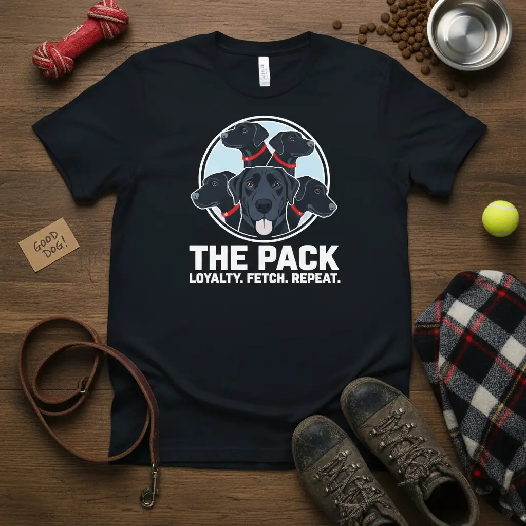 This striking design features the prominent phrase “THE PACK LOYALTY. FETCH. REPEAT.” set against a backdrop of five black Labrador heads arranged in a circular pattern. The central Labrador is larger, symbolizing the heart of the pack, while the surrounding heads represent the collective spirit and unity of these beloved animals. It’s a powerful visual representation for anyone who considers their dogs their pack.