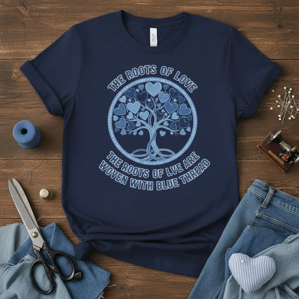 Embrace the sentiment and style of this unique t-shirt, a perfect blend of meaningful design and everyday comfort. The “Roots of Love The Roots of Lve Are Woven With Blue Thread” quote and the tree of hearts graphic create a powerful visual narrative that resonates deeply. Whether you’re buying it for yourself or as a gift, this tee is sure to become a cherished item, a constant reminder of the love that connects us all. Order yours today and let your love story be beautifully told!