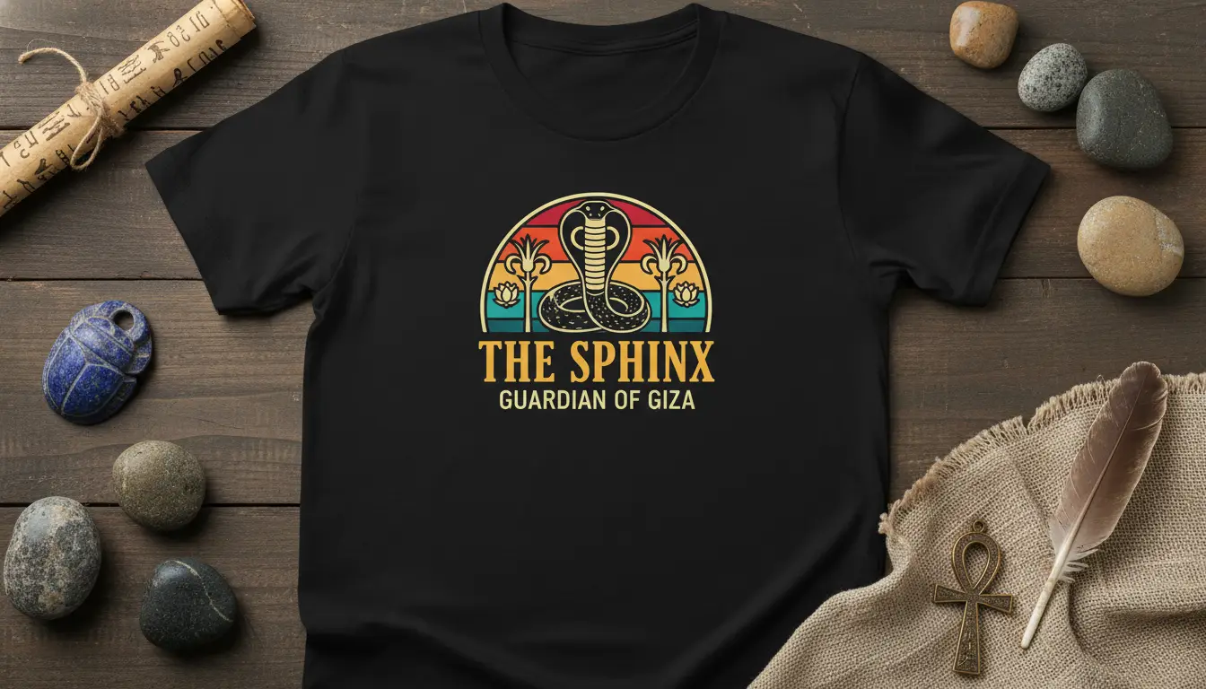 This captivating tee proudly displays “THE SPHINX GUARDIAN OF GIZA” in a striking, retro-inspired font. The central graphic features a coiled cobra, a potent symbol of protection and royalty in ancient Egyptian lore, set against a vibrant, stylized sunset. Flanked by elegant lotus flowers, the design evokes the timeless beauty and mystery of the Giza plateau. It’s more than just a t-shirt; it’s a wearable piece of history that sparks conversation and showcases a deep appreciation for ancient wonders.