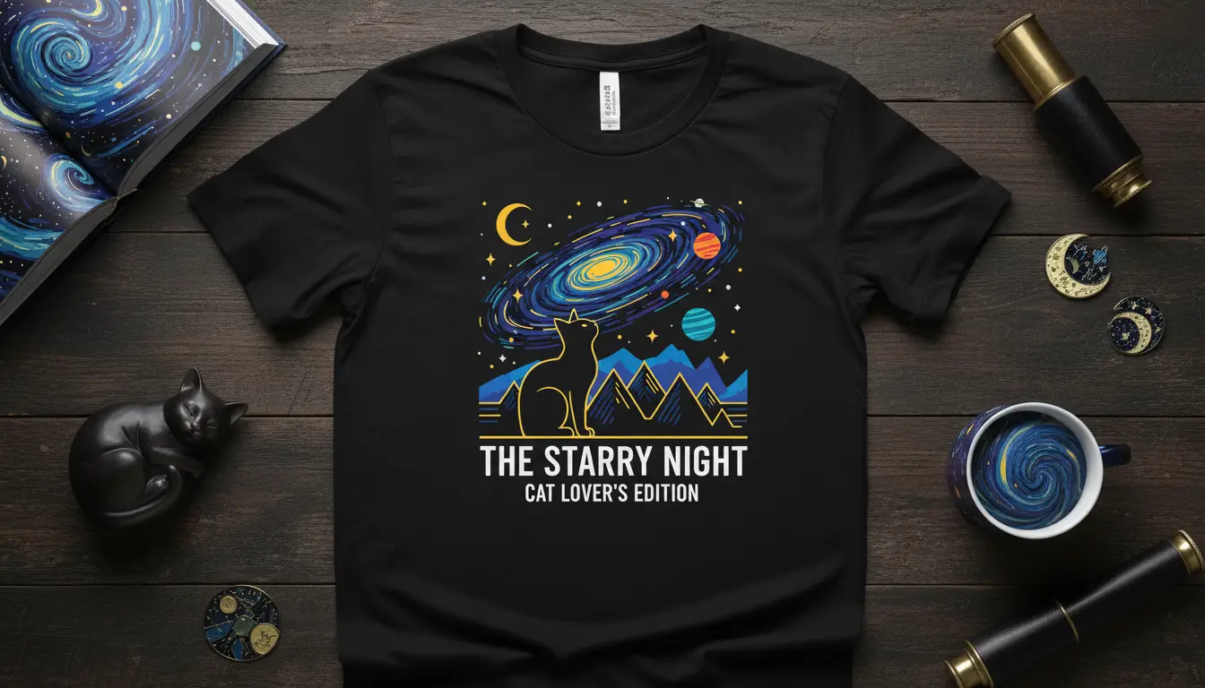 The Starry Night Cat Lover’s Edition design is a celestial masterpiece, perfect for those who find beauty in the night sky and adoration in their feline companions. This unique t-shirt blends artistic flair with a passion for cats and astronomy, creating a wearable work of art. It’s an ideal way to showcase your interests and spark conversations wherever you go. The intricate design captures the awe-inspiring grandeur of the cosmos alongside the quiet contemplation of a cat.