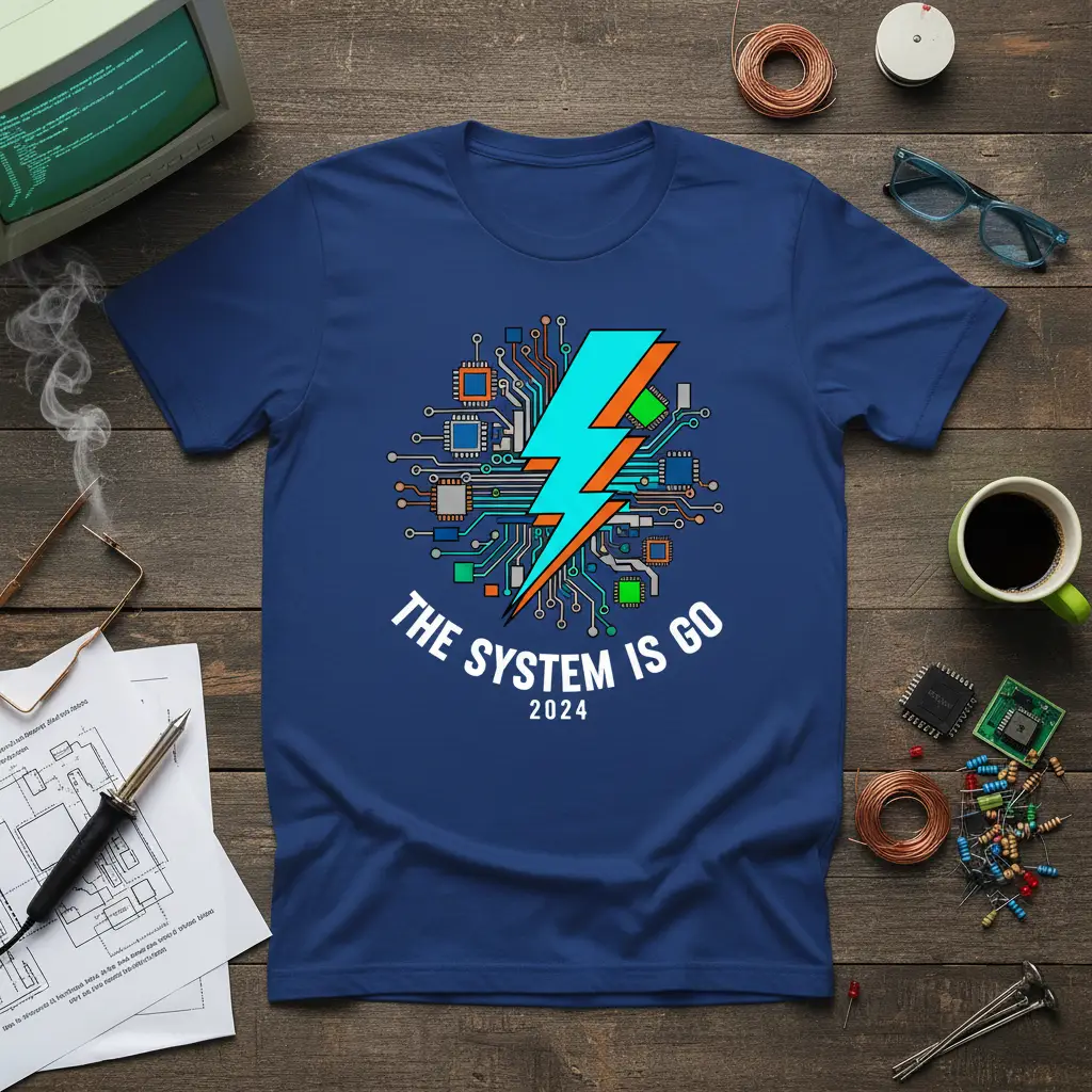 This striking design features a dynamic lightning bolt composed of intricate circuit board pathways, symbolizing the flow of energy and data. The bold white lettering “THE SYSTEM IS GO” arches proudly above the year “2024,” making it a perfect emblem for the current technological era. It’s a visual representation of progress, connectivity, and the ever-evolving digital landscape that shapes our world.