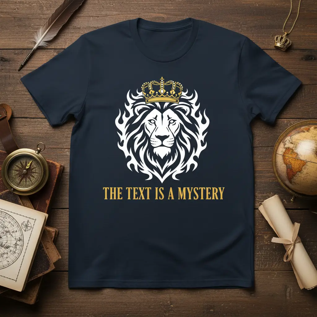 The majestic lion, a timeless symbol of courage and leadership, is rendered with striking detail, featuring sharp lines and a proud gaze. The golden crown signifies nobility and authority, adding a touch of opulence to the design. This “The Text Is A Mystery” t-shirt is not just about wearing a graphic; it’s about embodying a spirit of curiosity and confidence. It’s a perfect choice for those who like to keep others guessing and appreciate the beauty of the undefined.