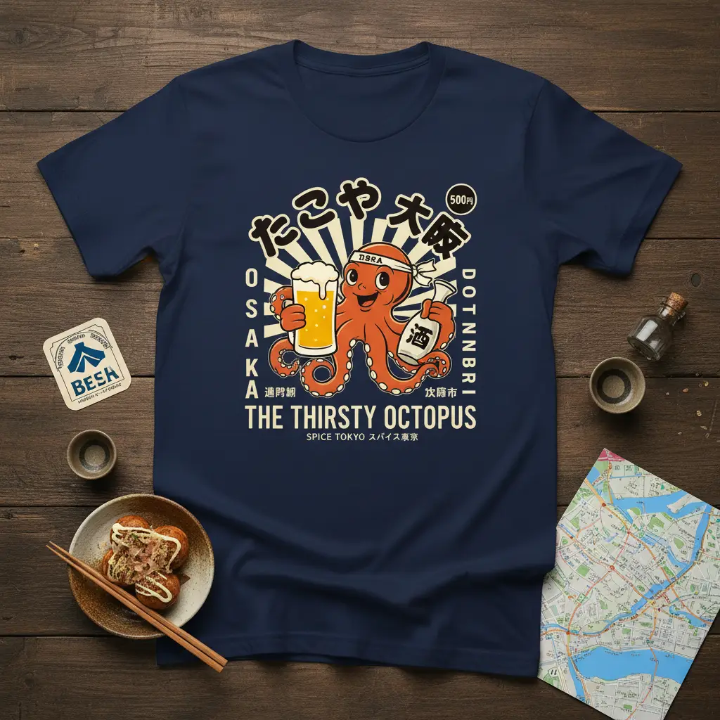 The inclusion of elements like “Takoyaki” (a popular Osaka street food) and a 500 Yen price tag adds an extra layer of detail and authenticity. This makes “The Thirsty Octopus” t-shirt a fantastic choice for travelers, food enthusiasts, or anyone captivated by Japanese culture. It’s a unique piece that stands out from typical graphic tees, offering a narrative and a sense of place.