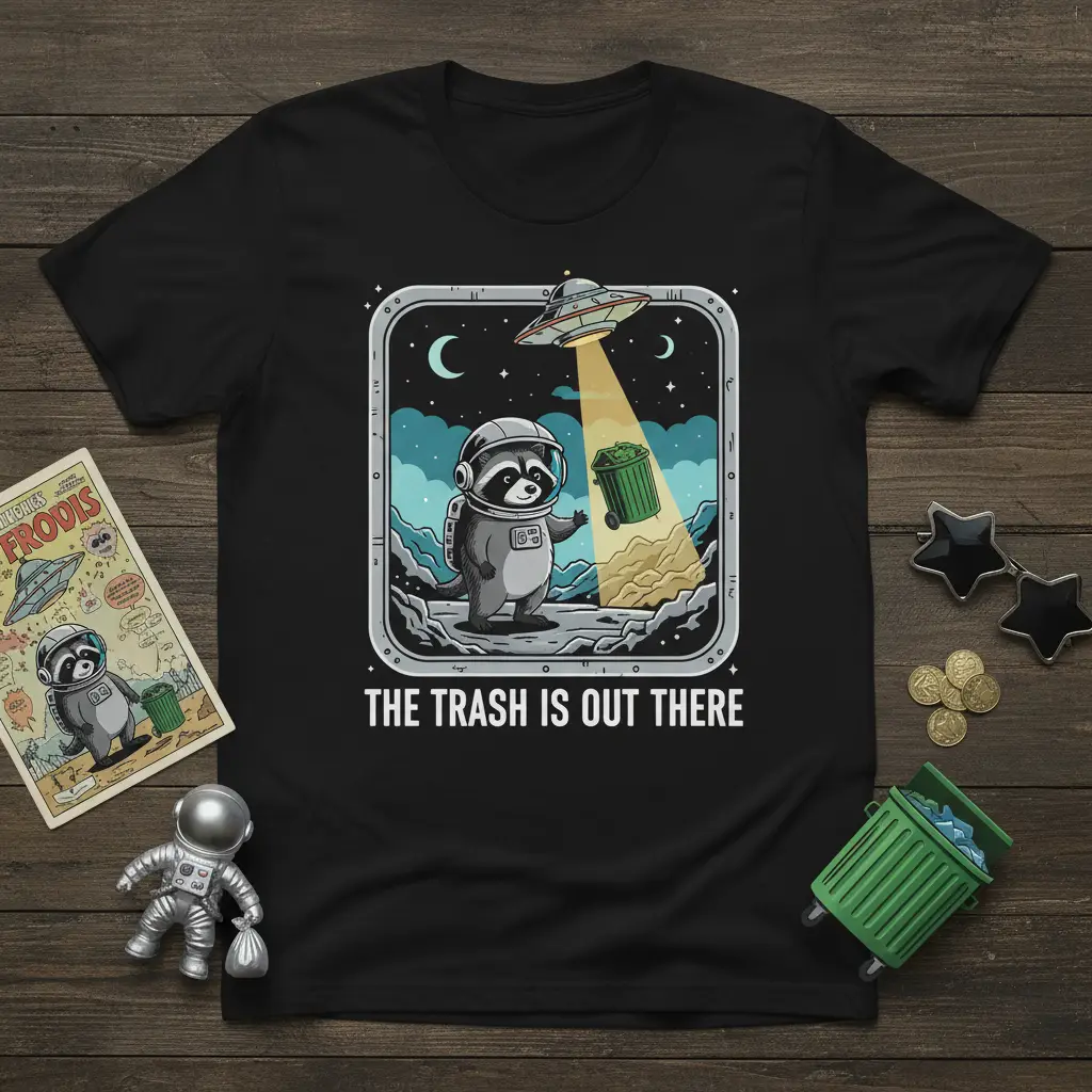 This captivating design features a determined raccoon, clad in an astronaut suit, standing on an alien landscape. Above, a classic flying saucer hovers, casting a beam of light that’s conveniently focused on a trash can. The bold text “THE TRASH IS OUT THERE” perfectly encapsulates the humorous narrative of this stellar scene.