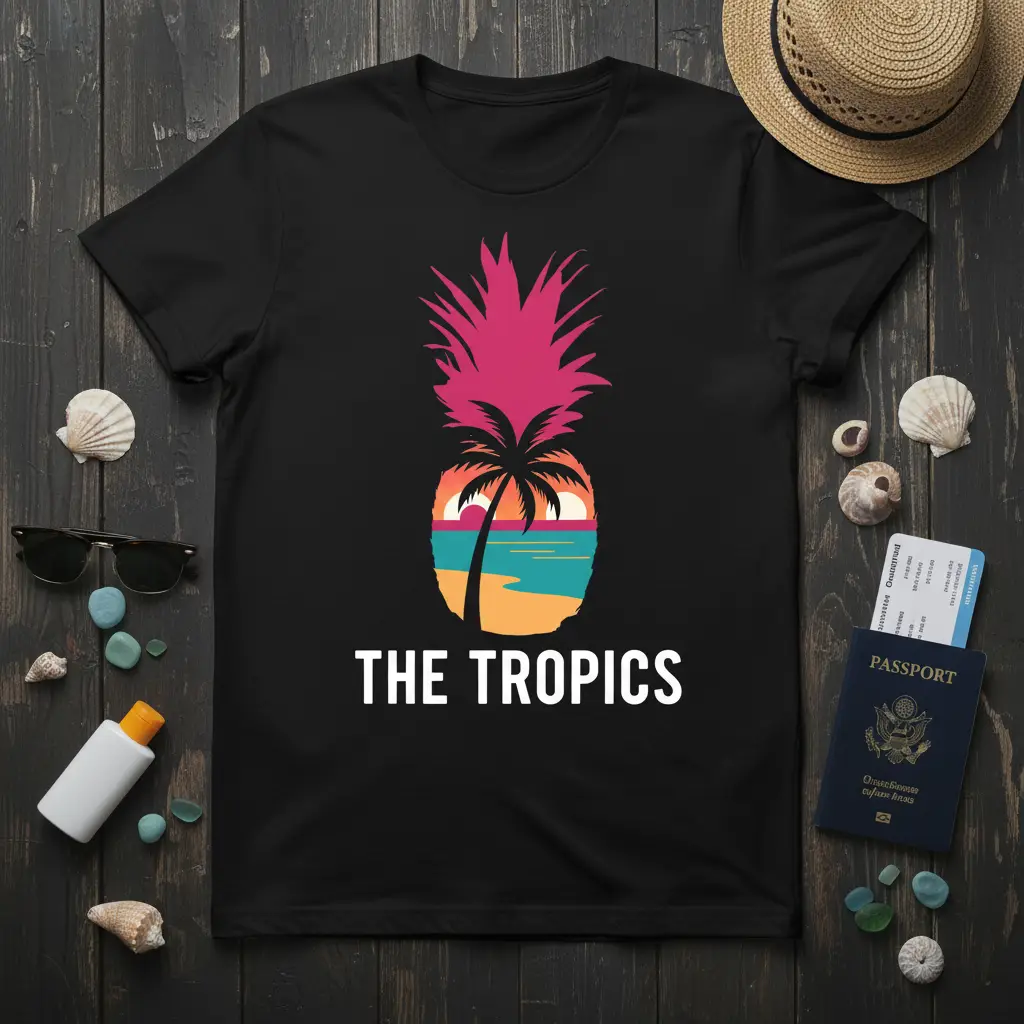 The bold “THE TROPICS” text anchors the design, making a clear statement of your wanderlust and love for all things summery. Whether you’re planning your next adventure or simply reminiscing about past trips, this t-shirt is the perfect way to keep the vacation spirit alive. It’s comfortable, stylish, and imbued with the energy of a perfect sunny escape.