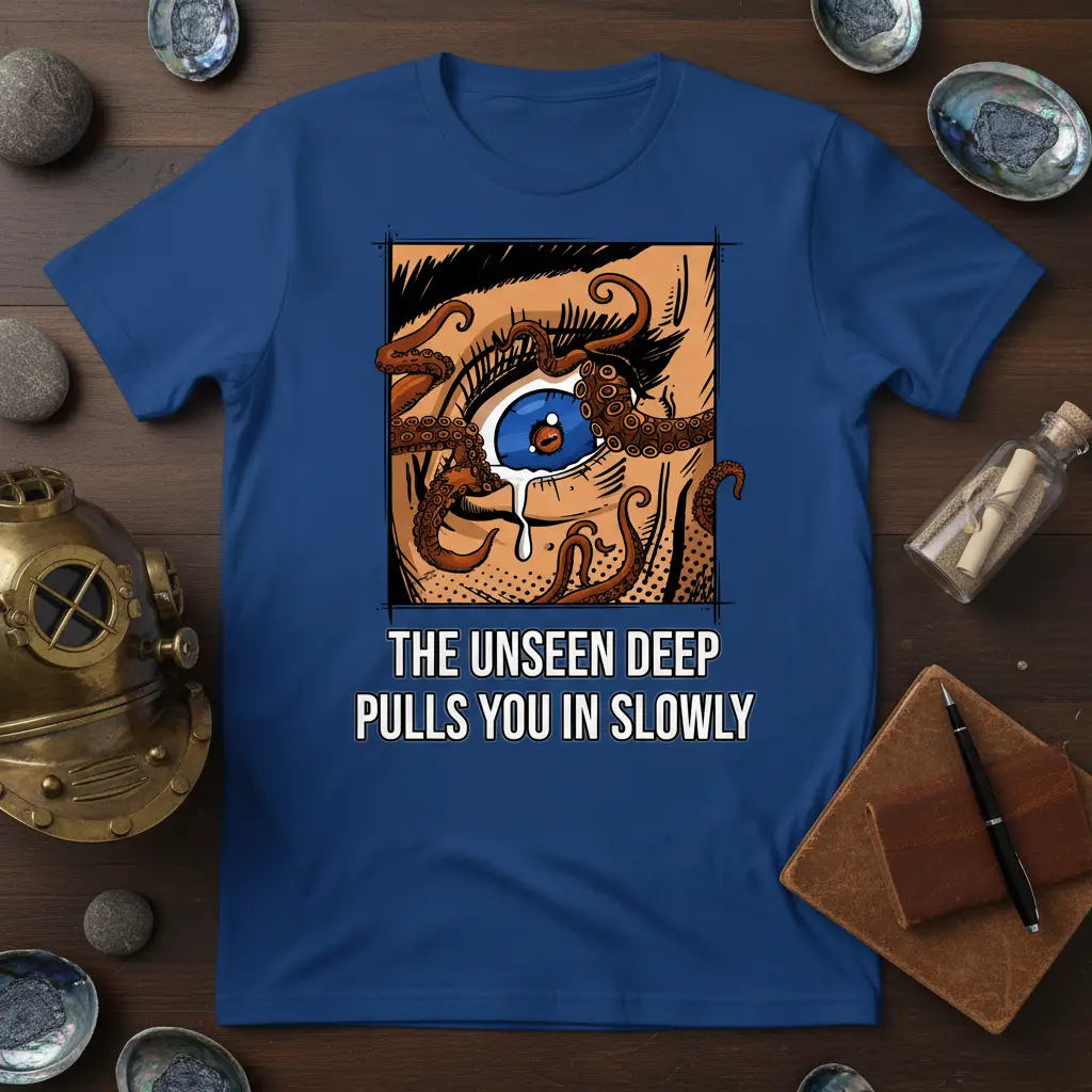 This design is a perfect conversation starter for anyone with a passion for the ocean, marine biology, or dark fantasy themes. The phrase “The Unseen Deep Pulls You In Slowly” hints at stories of ancient mariners, mythical sea creatures, and the sheer, unyielding power of the ocean. It appeals to a sense of adventure and curiosity, encouraging wearers to explore their own fascination with what lies beneath the waves. The detailed illustration of the eye and tentacles adds a layer of artistic depth, making it a piece that can be appreciated for its aesthetic qualities as well as its thematic resonance.