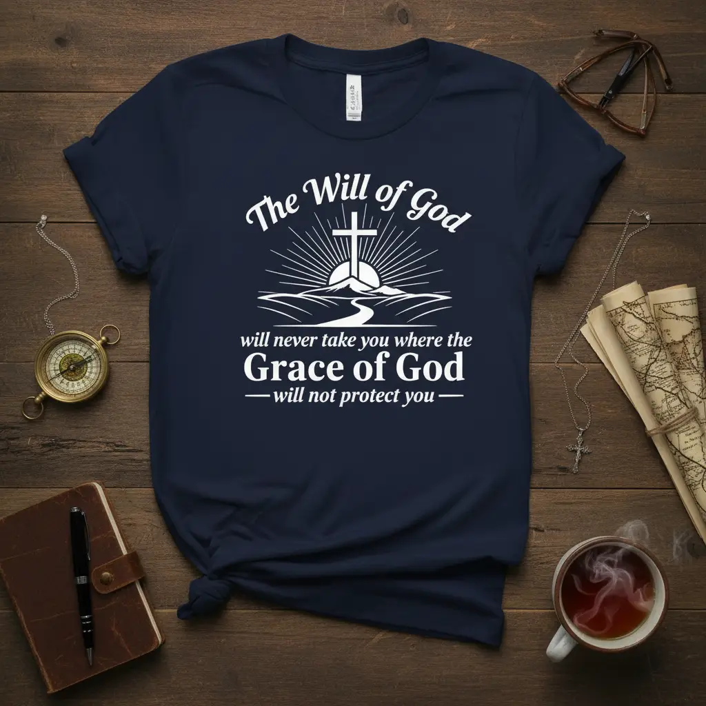 The Will of God will never take you where the Grace of God will not protect you, making this t-shirt a profound statement of faith and trust. This garment is designed for those who find strength and solace in their spiritual journey. It serves as a constant reminder of divine guidance and unwavering protection, embodying a deep connection to Christian beliefs. Wear it as a personal affirmation or share its message with loved ones, spreading inspiration and comfort wherever you go.
