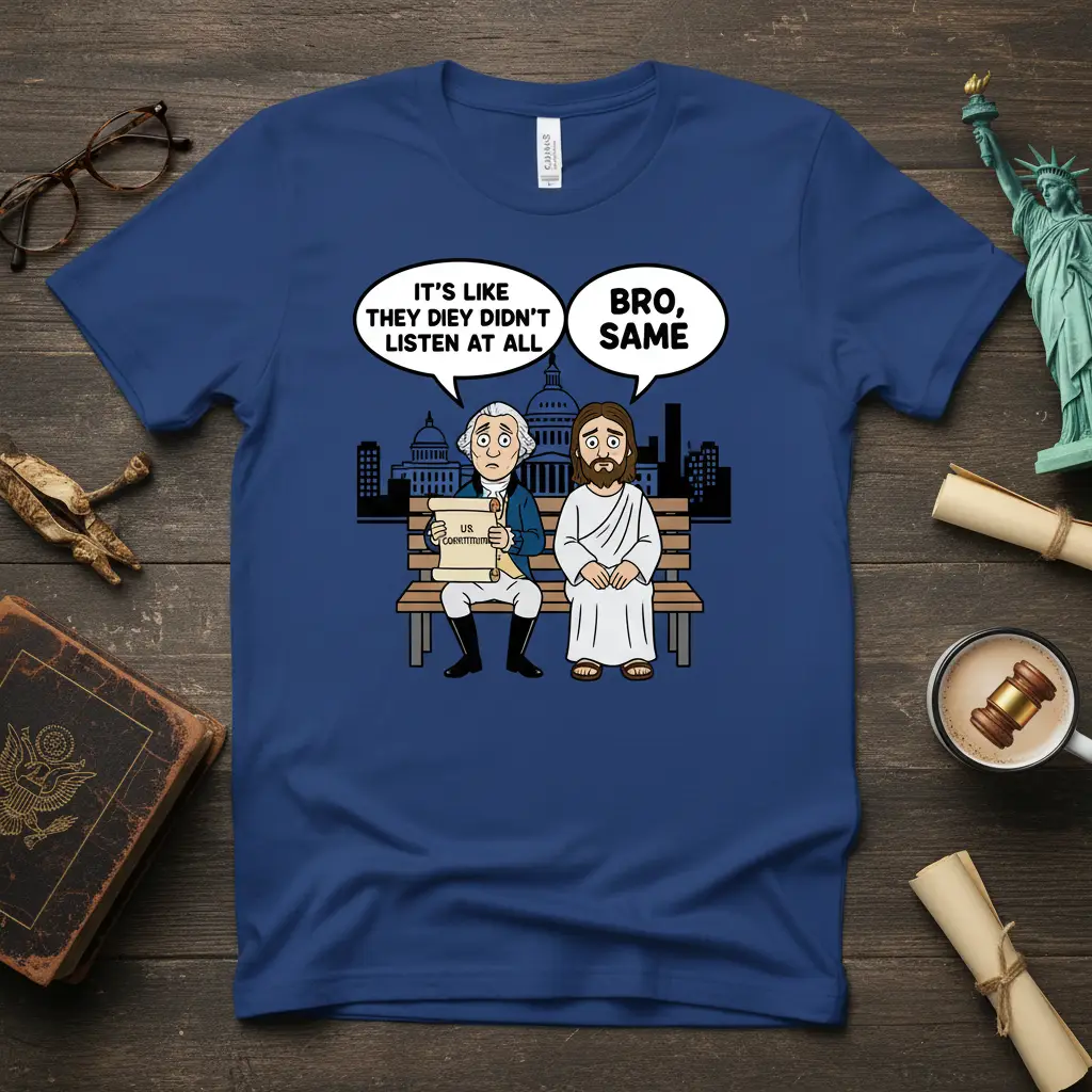 This design humorously depicts George Washington, clutching the U.S. Constitution, and Jesus Christ, both looking equally bewildered and resigned. Their shared expression of exasperation perfectly encapsulates the feeling of trying to communicate important ideas only to find they fall on deaf ears. The quote “It’s Like They Die Y Didn’t Listen At All” is attributed to Washington, with Jesus’s immediate and equally unimpressed response, “Bro, Same,” adding a contemporary twist. This juxtaposition of historical gravitas with casual modern slang creates a memorable and shareable image.