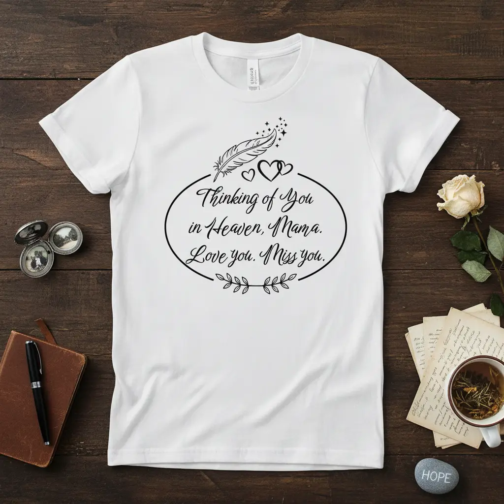 This special t-shirt beautifully captures the sentiment of missing a mother who is no longer physically present. The phrase “Thinking of You in Heaven, Mama” is rendered in a delicate, flowing script that evokes a sense of tenderness and love. It’s a design that speaks directly to the heart of anyone grieving the loss of their maternal figure.