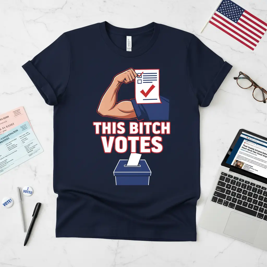 Pick from Black, Navy, Royal, Dark Heather, Red, and White to match your mood and wardrobe staples. Each colorway keeps the THIS BITCH VOTES design clear and photo-ready for everyday wear.