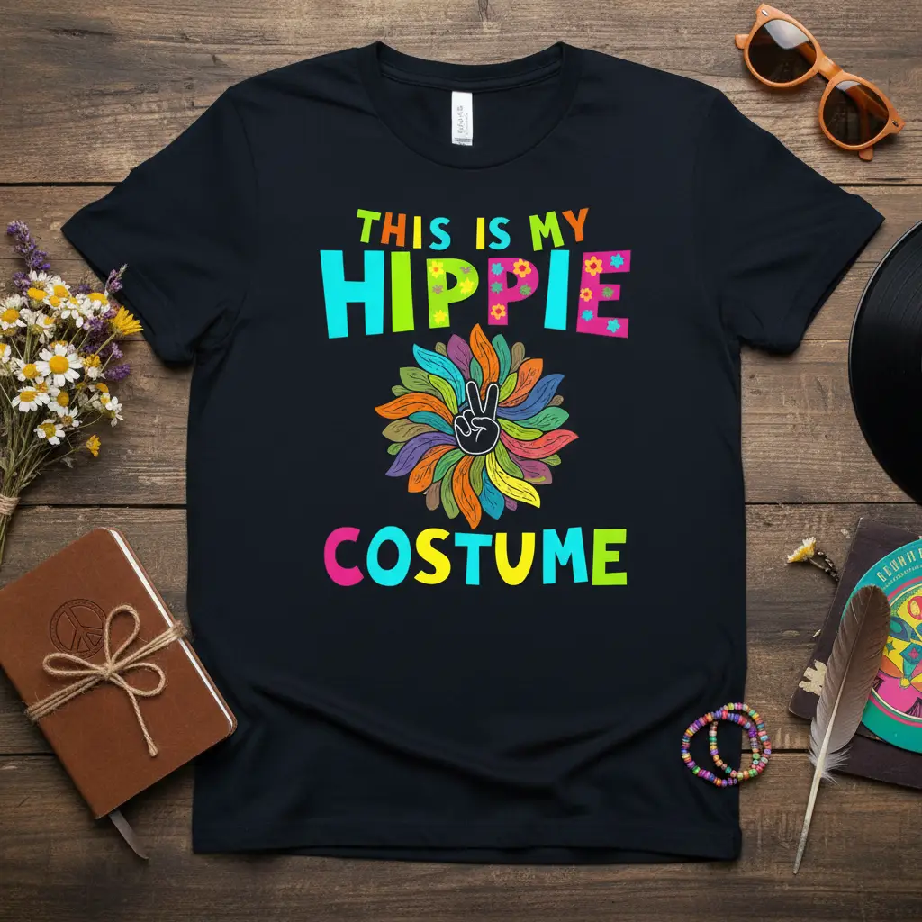 This THIS IS MY HIPPIE COSTUME design is the ultimate solution for anyone looking for an easy yet impactful costume. Forget complicated outfits; simply slip on this shirt and you’re ready to go. It’s ideal for Halloween, themed birthday parties, retro nights, or any event where a fun and festive atmosphere is key. The vibrant colors and clear message make it instantly recognizable as a symbol of the swinging sixties and seventies, ensuring you fit right in with the groovy crowd.