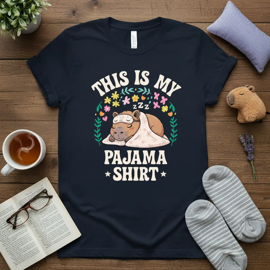 The “This Is My Pajama Shirt” design is a delightful tribute to relaxation and the simple pleasure of a good night’s sleep, or even just a really good nap. It features a sweet capybara, known for its chill demeanor, peacefully snoozing away. This imagery perfectly encapsulates the feeling of ultimate coziness, making it the ideal attire for anyone who loves to lounge in style. The vibrant floral accents add a touch of cheerfulness, ensuring that even your sleepwear makes a statement.