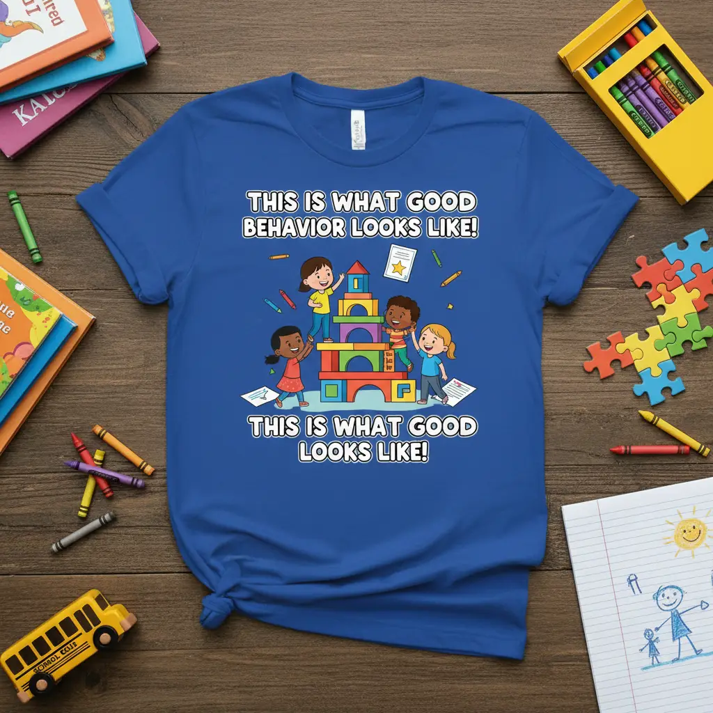 This Is What Good Behavior Looks Like! This Is What Good Looks Like! This engaging t-shirt is designed to celebrate and encourage positive actions in children, making it a perfect addition to any young learner’s wardrobe. The vibrant graphic, featuring children working together to build a colorful block tower, visually represents cooperation and achievement. It serves as a daily reminder of the importance of kindness, teamwork, and good deeds. This shirt is not just apparel; it’s a statement piece that fosters a positive environment and acknowledges the wonderful efforts of children. It’s an excellent way for parents and educators to show appreciation for good behavior.