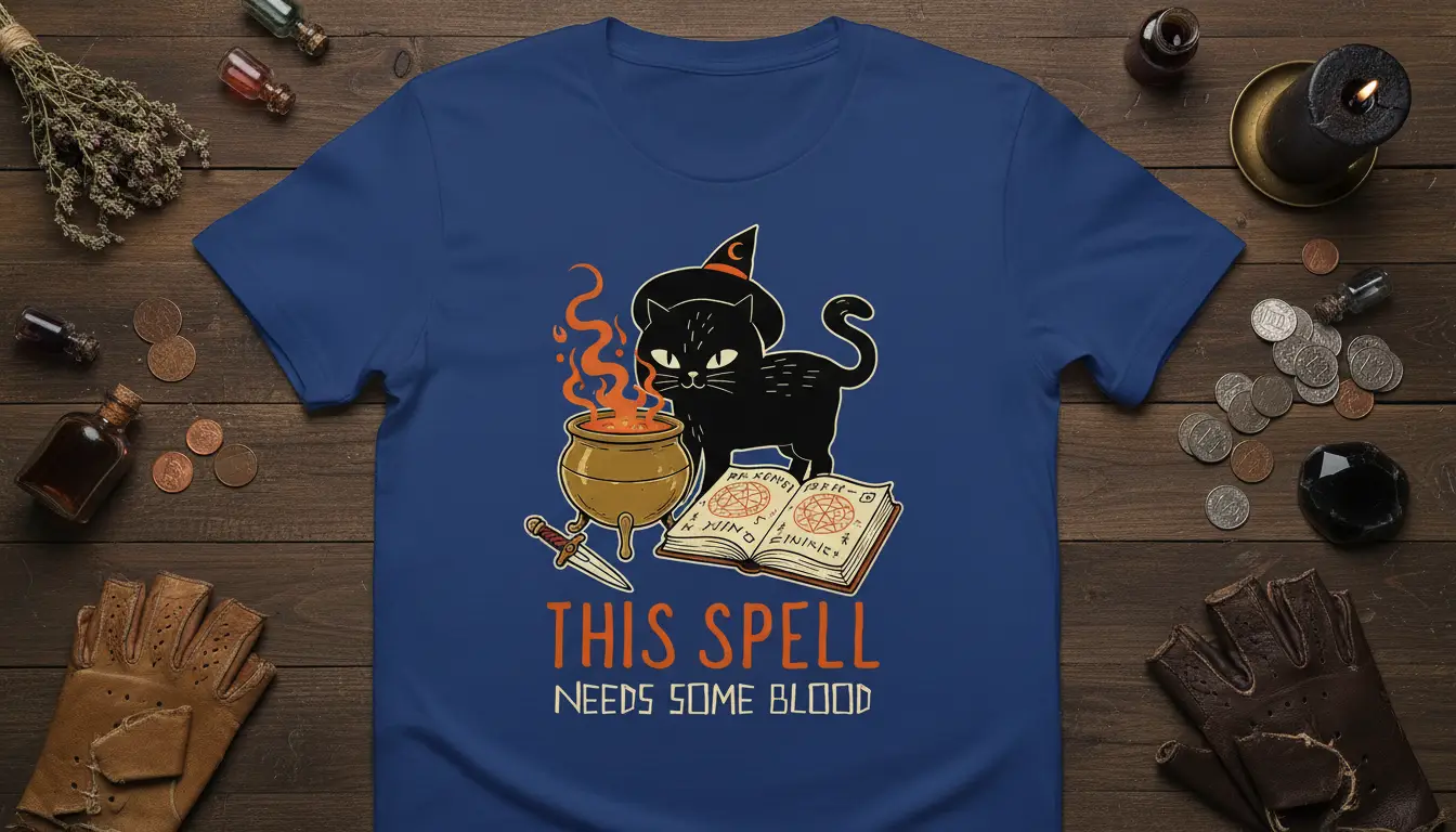 The visual narrative of the design—a black cat intent on its magical task—invites imagination and storytelling. It taps into the folklore and mystique surrounding cats and witchcraft, creating a compelling aesthetic. This THIS SPELL NEEDS SOME BLOOD design is sure to become a favorite for casual outings, themed parties, or simply lounging around while embracing your inner enchantress or enchanter.
