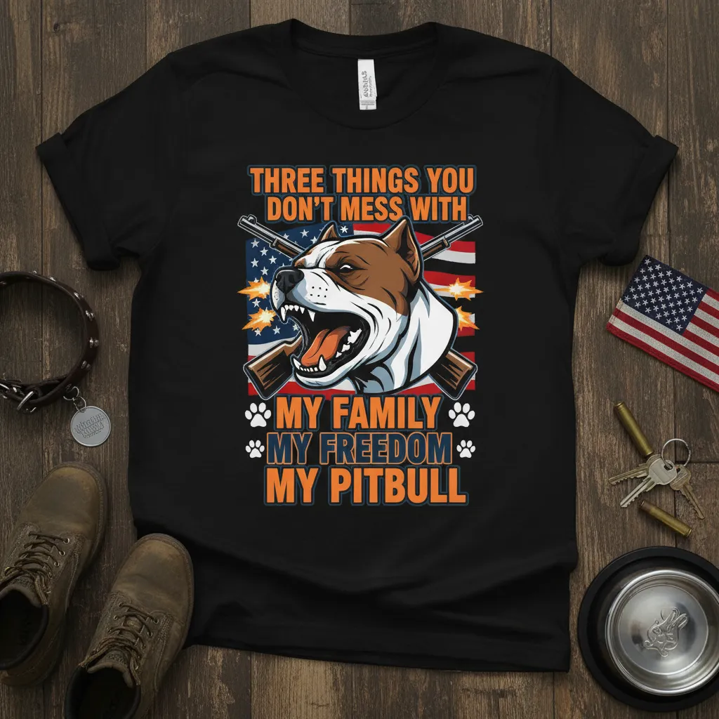 THREE THINGS YOU DON’T MESS WITH MY FAMILY MY FREEDOM MY PITBULL is more than just a phrase; it’s a declaration of unwavering loyalty and core beliefs. This powerful statement embodies the fierce protectiveness of a pitbull owner, the deep love for family, and the cherished value of freedom. It’s a sentiment that resonates with those who understand the unique bond shared with their canine companions and their patriotic spirit. This design is crafted for individuals who proudly wear their values and want to make a bold statement about what matters most to them.