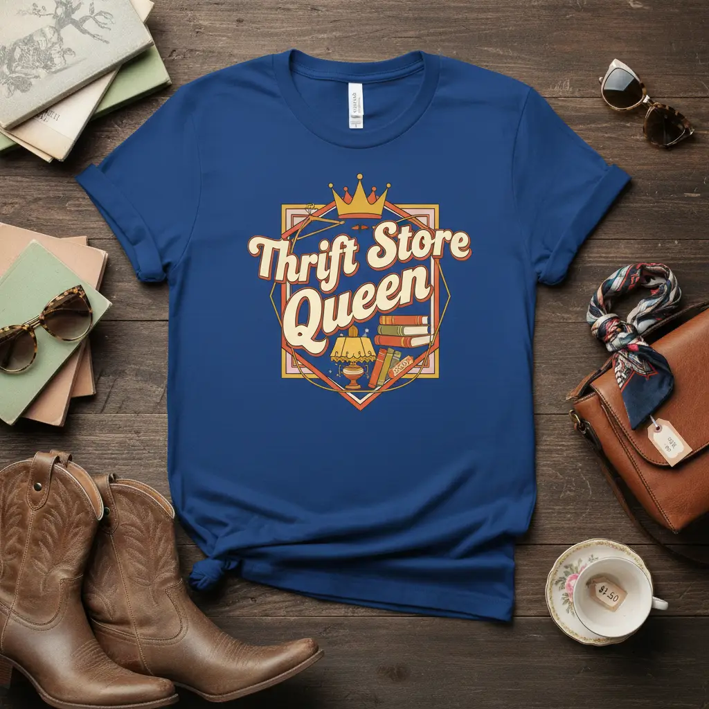 Pick from Black, Navy, Royal, Dark Heather, Red, and White to match your mood and wardrobe staples. Each colorway keeps the Thrift Store Queen design clear and photo-ready for everyday wear.