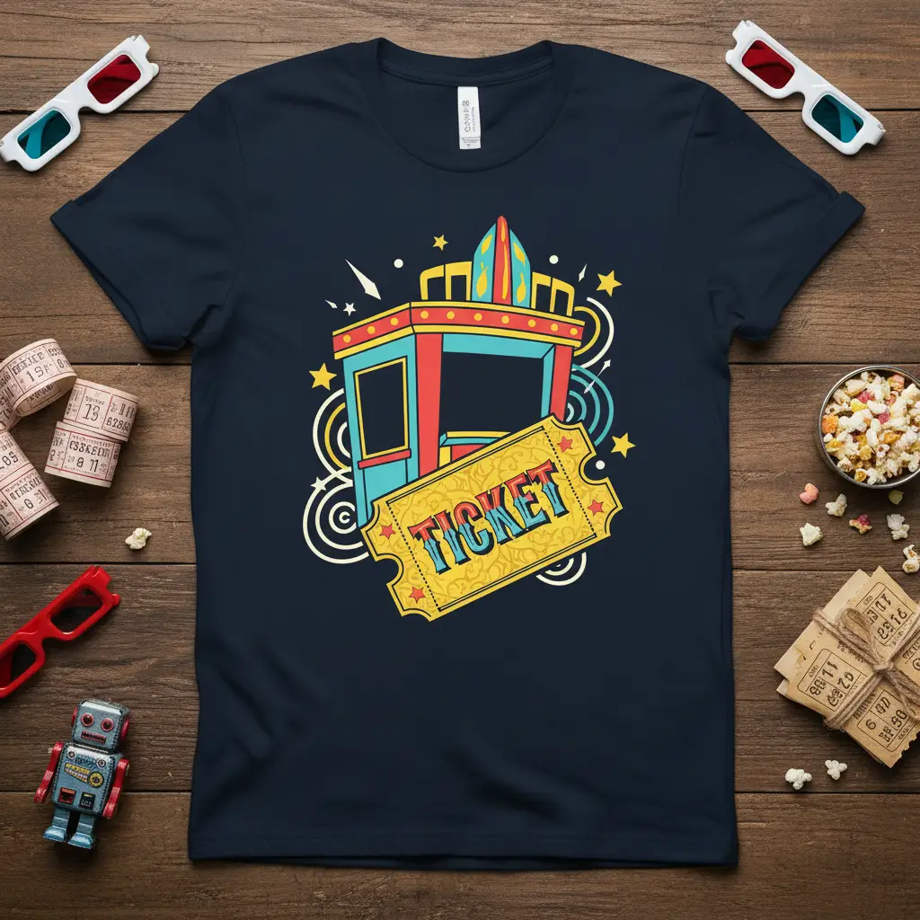 This vibrant t-shirt features the word “TICKET” emblazoned in a bold, retro font, instantly evoking the golden age of cinema. The design is complemented by a whimsical carnival booth illustration, complete with stars and playful swirls, reminiscent of classic movie posters and fairground attractions. It’s the perfect piece to celebrate your love for movies, whether you’re a fan of blockbusters, indie films, or timeless classics.