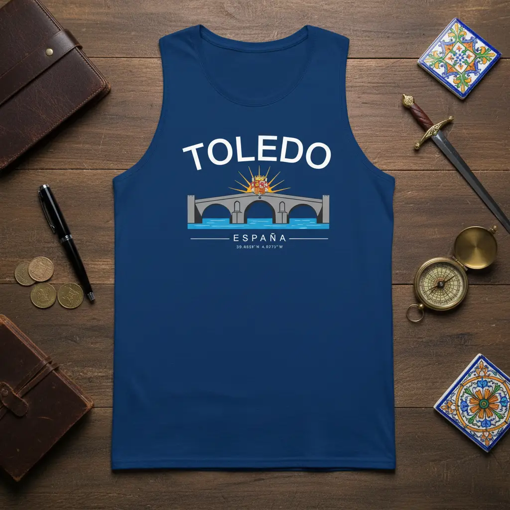This tank top proudly features the name “TOLEDO ESPAÑA” in clear, bold lettering, immediately identifying the beloved city. Below the text, a striking graphic depicts the iconic Toledo bridge, a symbol of the city’s rich history and architectural beauty, spanning the tranquil waters. The inclusion of the exact coordinates, 39.8558° N 4.0273° W, adds a unique and personal touch, appealing to those who appreciate detail and the spirit of exploration.
