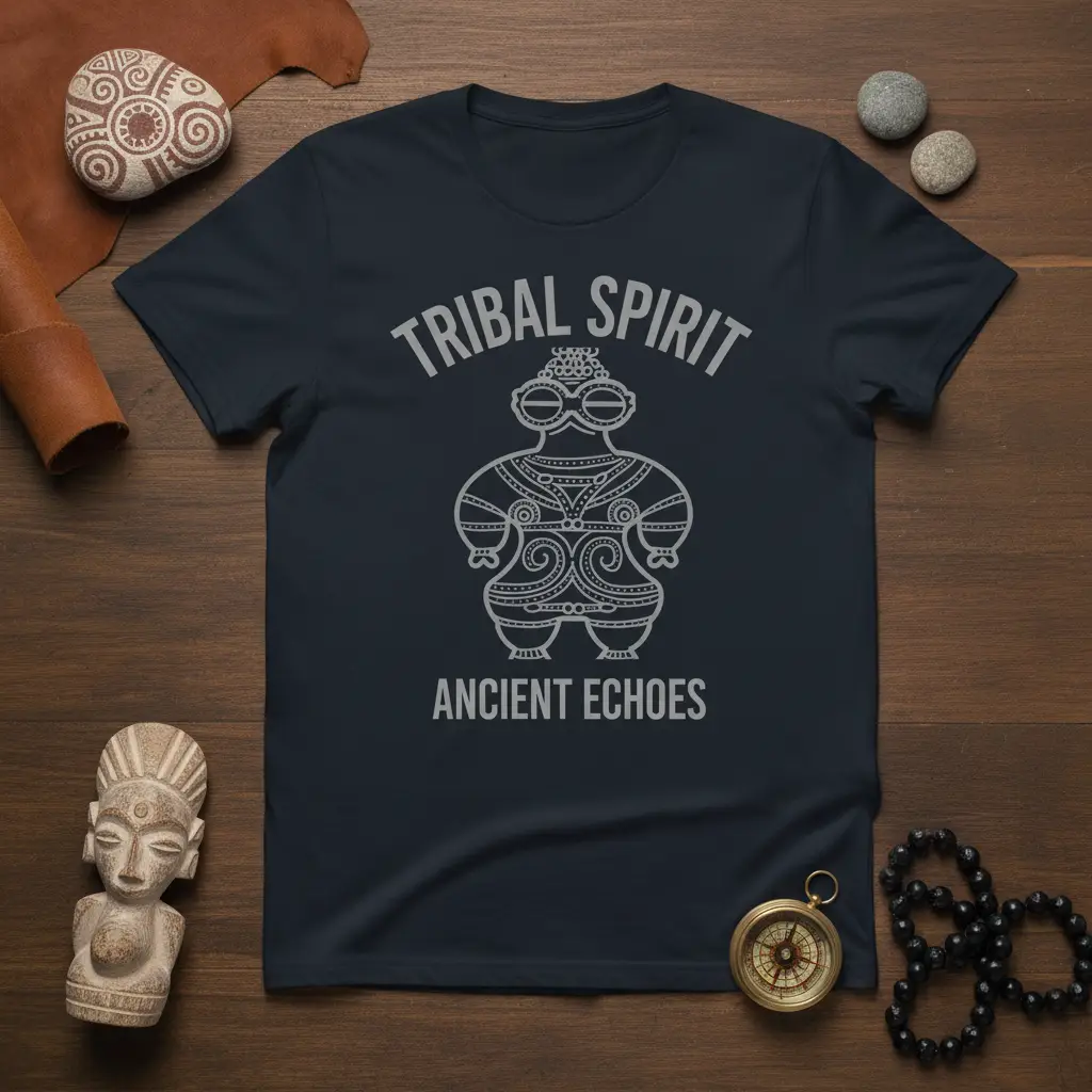 The captivating “Tribal Spirit Ancient Echoes” design features a central, stylized figure that evokes ancient goddesses and fertility symbols found across various historical cultures. Its intricate patterns and swirling motifs are reminiscent of early artistic expressions, designed to resonate with a sense of deep history and spiritual significance. The text above and below the graphic reinforces this theme, creating a cohesive and powerful statement piece.