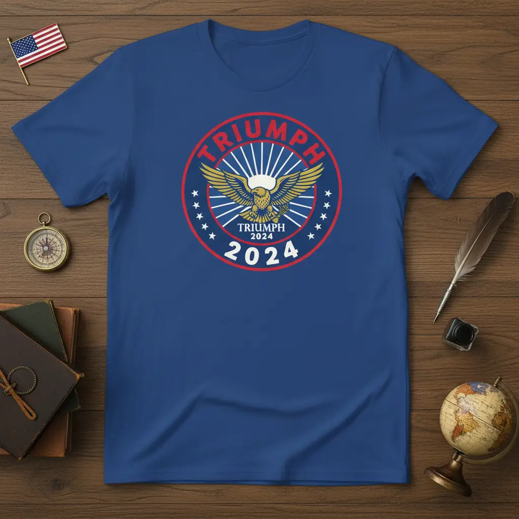 This striking t-shirt features the bold “Triumph 2024” text prominently displayed, making a clear and strong statement. The design is centered around a majestic eagle, a classic symbol of strength, freedom, and patriotism. Radiating lines and surrounding stars complete the emblem, creating a visually compelling and impactful graphic that captures the essence of national pride and political aspiration.
