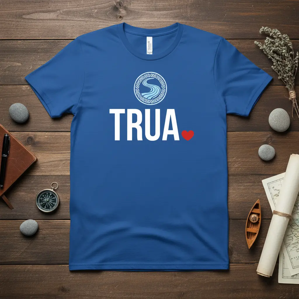 Above the “TRUA” text, a circular emblem features a stylized Celtic-inspired river graphic. This intricate design adds a layer of depth and cultural significance to the t-shirt. The flowing water within the knotwork symbolizes life, continuity, and the journey of discovery often associated with travel and personal connection to a place like TRUA.
