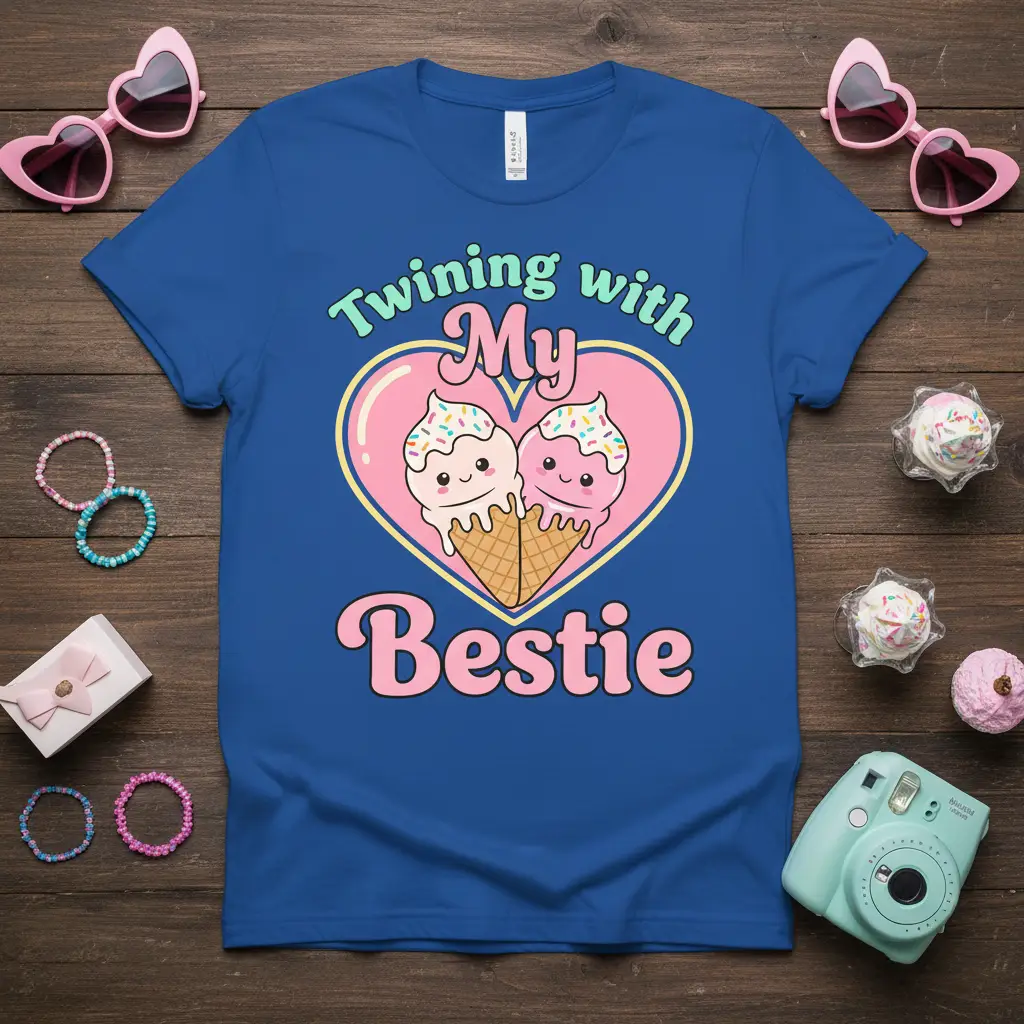 Pick from Black, Navy, Royal, Dark Heather, Red, and White to match your mood and wardrobe staples. Each colorway keeps the Twining with My Bestie design clear and photo-ready for everyday wear.