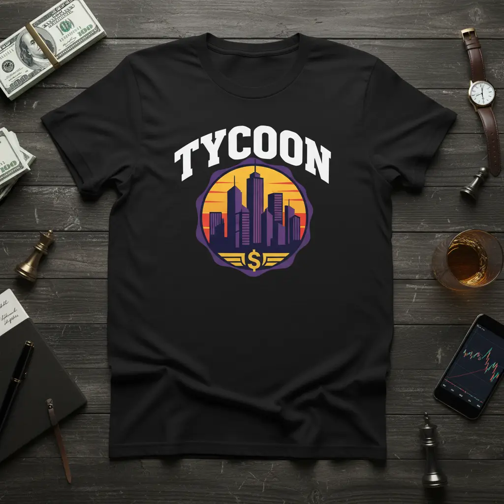 This exclusive Tycoon t-shirt is crafted for those who operate at the highest levels of business and finance. The striking design features the bold word “TYCOON” emblazoned across the chest, signifying leadership and dominance. Below it, a vibrant graphic depicts a modern cityscape at sunset, symbolizing growth, opportunity, and the urban landscape where empires are built. A prominent dollar sign emblem anchors the design, representing wealth and financial acumen.