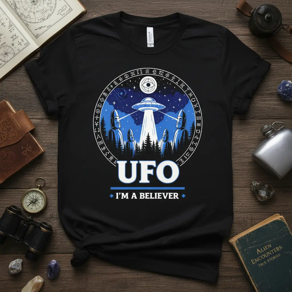 The phrase “UFO I’M A BELIEVER” is prominently displayed, leaving no doubt about the wearer’s stance on the existence of extraterrestrial visitors. This design is perfect for sparking conversations at gatherings, conventions, or simply as a daily expression of your beliefs. It taps into a deep-seated curiosity about the universe and our place within it, making it a cherished item for any ufology enthusiast.