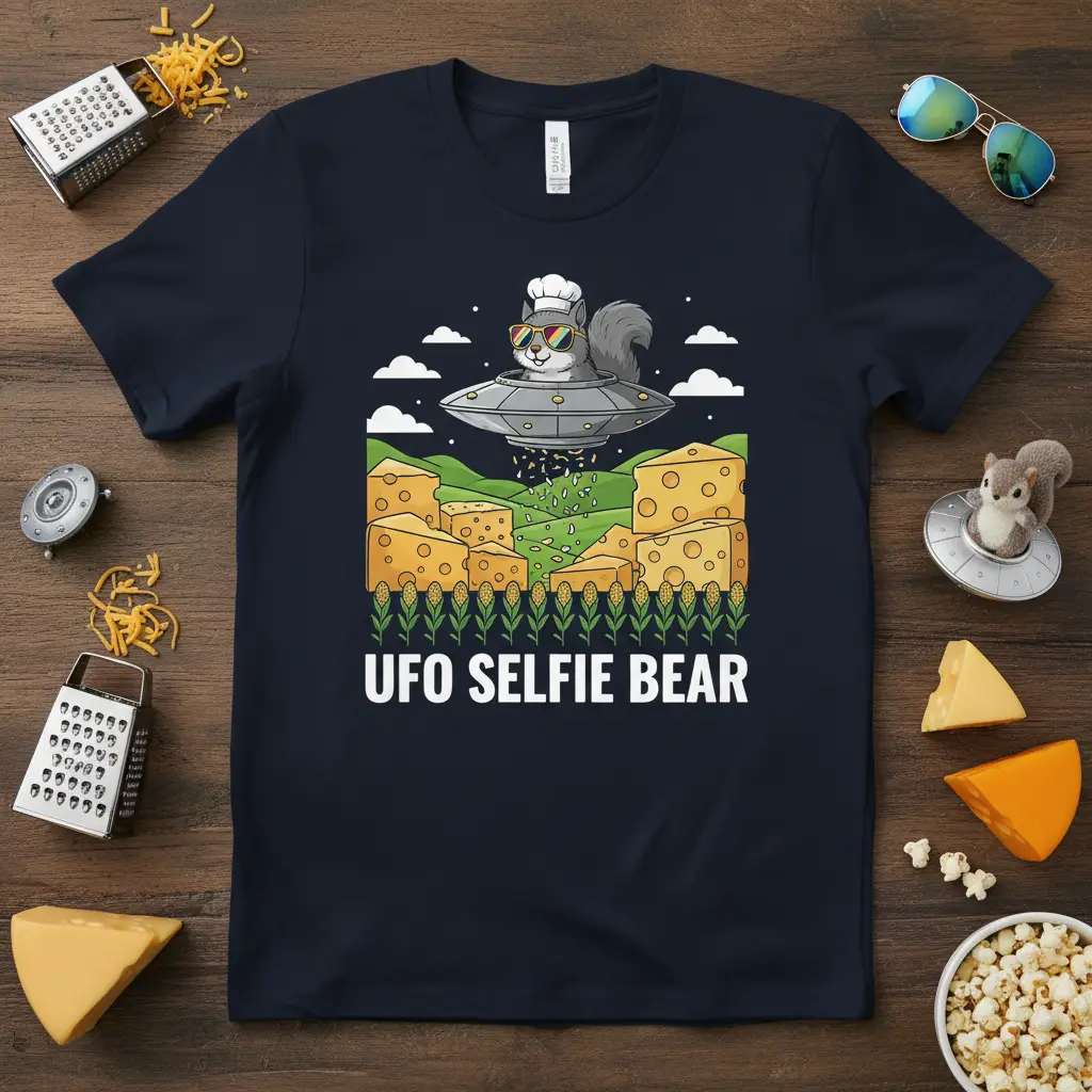 This captivating design features a charming squirrel, sporting a chef’s hat and cool sunglasses, piloting a flying saucer. The UFO hovers mysteriously over a landscape dotted with giant blocks of cheese and neat rows of corn stalks. Scattered kernels fall from the spacecraft, adding a playful touch to the scene. The bold white text “UFO SELFIE BEAR” anchors the design, making it instantly recognizable and delightfully quirky.