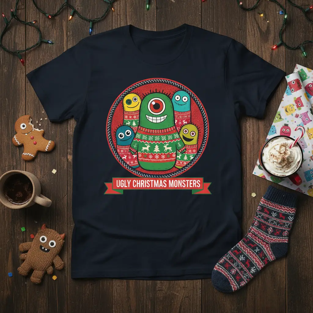 The centerpiece of this shirt is a collection of adorable, yet delightfully “ugly” Christmas monsters, each sporting a uniquely patterned sweater. From snowflakes to reindeer motifs, these festive knits add an authentic touch of holiday spirit to each character. The circular design, framed by a textured border reminiscent of a cozy knit, enhances the overall charm and appeal of the artwork.