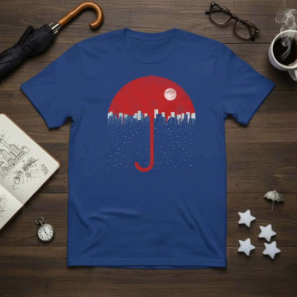This visually stunning t-shirt design offers a fresh perspective on urban living, merging the everyday practicality of an umbrella with the dramatic beauty of a snowy night. The vibrant red umbrella acts as a protective canopy over a detailed city skyline, while countless small white dots suggest falling snow, all under the glow of a prominent full moon. This creates a dreamy, almost surreal atmosphere that appeals to art lovers and city dwellers alike. It’s an exceptional piece for anyone seeking apparel that stands out from the ordinary.