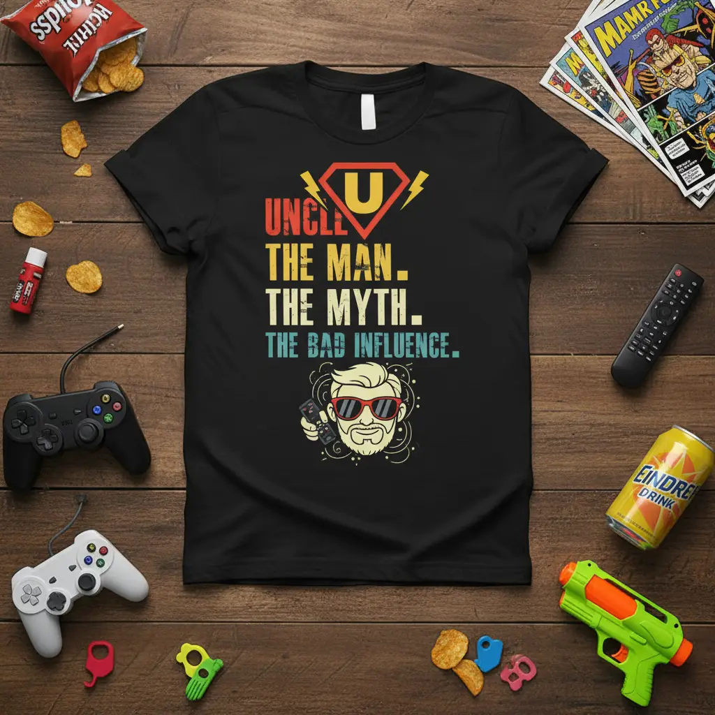 This t-shirt proudly displays the iconic phrase “Uncle The Man. The Myth. The Bad Influence.” in a bold, retro-inspired font. The design is accented with a vibrant superhero ‘U’ logo and a playful illustration of a stylish uncle holding a remote control, ready for action or relaxation. It’s a statement piece that will surely turn heads and spark conversations.