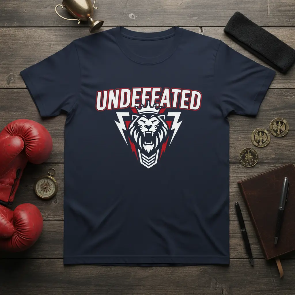 This striking t-shirt proudly showcases the word “UNDEFEATED” in bold, impactful lettering, accented by a fierce lion emblem. The design embodies the essence of combat sports, athletic competition, and the unyielding spirit required to achieve greatness. Every element, from the roaring lion to the sharp graphic accents, speaks to a legacy of resilience and triumph.