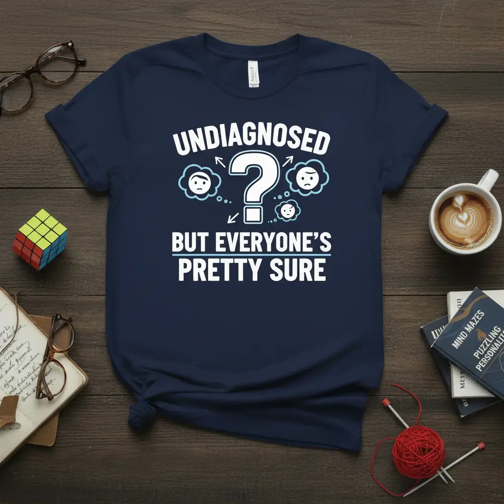 The phrase “undiagnosed but everyone’s pretty sure” is a clever nod to the internal experiences we have that might not have a neat, tidy label. It resonates with many, offering a shared sense of understanding and amusement. This design invites smiles and nods of recognition, making it a wonderfully engaging item of clothing.