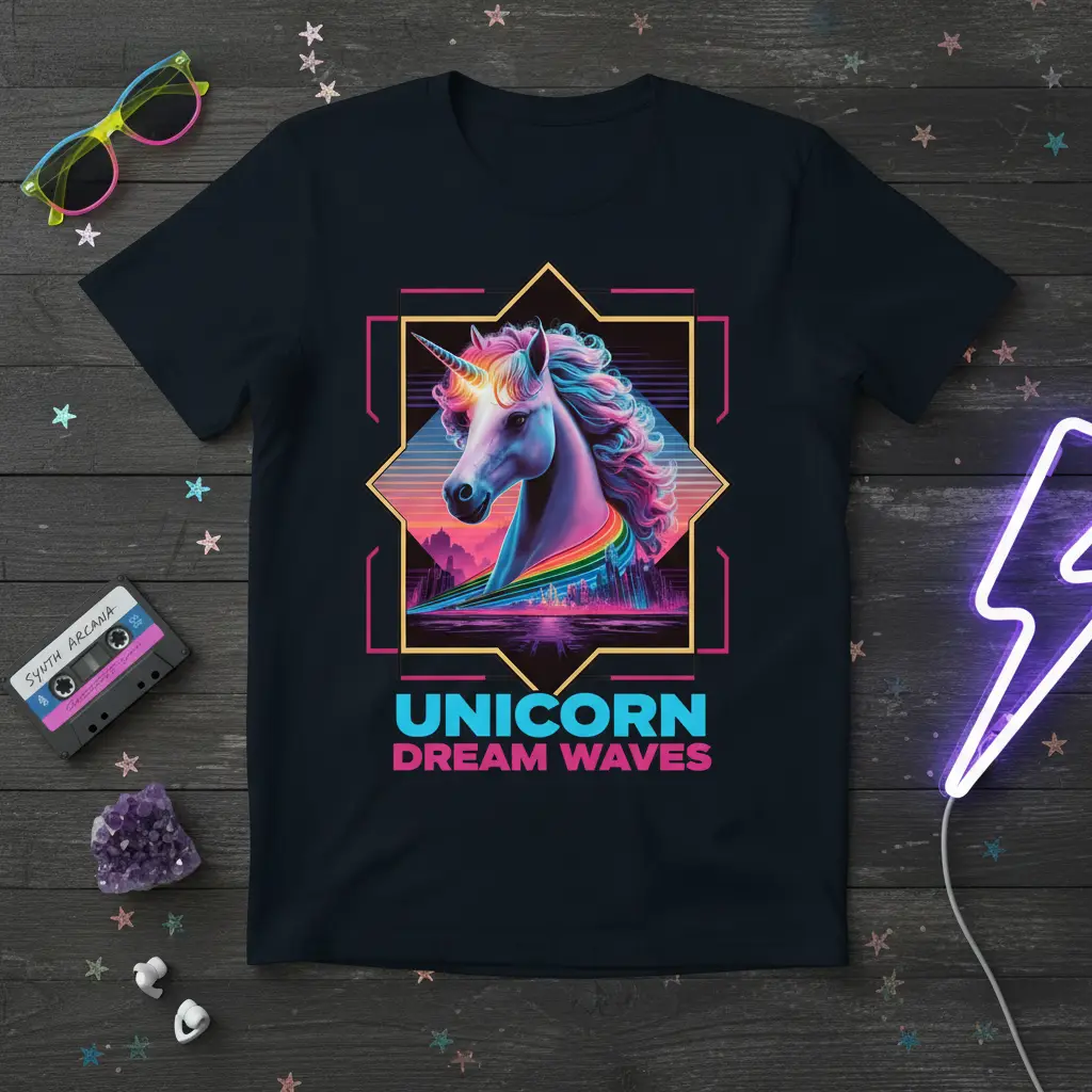 UNICORN DREAM WAVES come to life on this striking t-shirt, designed for those who believe in magic and embrace vibrant, retro aesthetics. This tee is more than just apparel; it’s a statement piece that captures the imagination with its unique blend of mythical charm and nostalgic neon vibes. Perfect for adding a touch of fantasy to your everyday wardrobe, it’s sure to turn heads and spark conversations. Dive into a world of dreams and wonder with this captivating design.