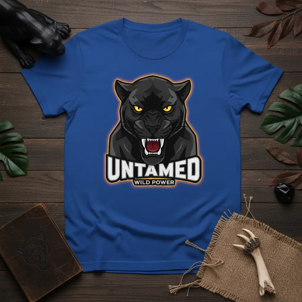 The rich blue color of the t-shirt serves as a perfect canvas for the striking black panther and bold text, making the design pop. This combination creates a visually appealing garment that is both fashionable and meaningful. It’s a versatile piece that can be paired with jeans, shorts, or layered under a jacket for a complete look. This UNTAMED WILD POWER design’s power and the shirt’s comfort make it an ideal choice for expressing personal style and strength.
