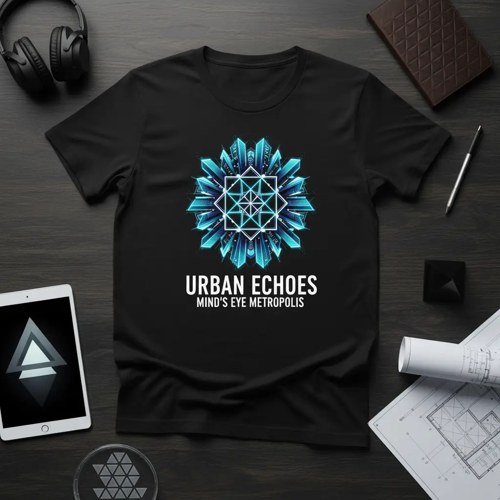 The URBAN ECHOES MIND’S EYE METROPOLIS t-shirt features a central, complex geometric mandala that radiates outwards, mimicking the sharp angles and interconnectedness of a sprawling city. Glowing blue lines and crystalline structures evoke a sense of advanced technology and innovative design. This visual narrative represents the echoes of urban life and the boundless possibilities envisioned by the mind’s eye. It’s a concept that appeals to dreamers, architects, and anyone captivated by the dynamic energy of city living.