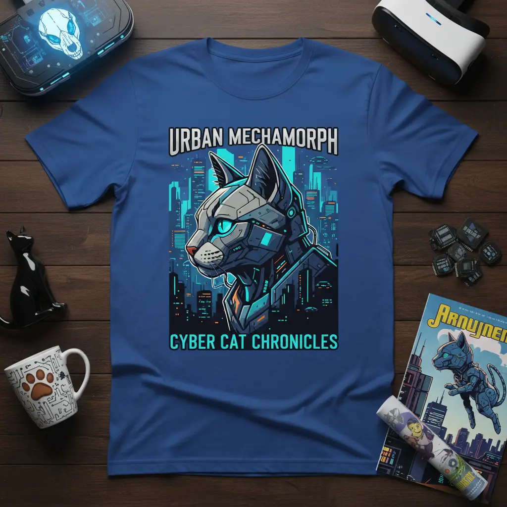 URBAN MECHAMORPH CYBER CAT CHRONICLES brings a futuristic vision to your wardrobe with this uniquely designed t-shirt. This graphic tee features a stunning illustration of a cybernetic cat, blending the sleekness of advanced robotics with the enigmatic charm of felines. Set against a vibrant, neon-lit urban skyline, the design captures the essence of a sci-fi adventure, perfect for those who appreciate cutting-edge aesthetics and a touch of mystery. It’s more than just apparel; it’s a statement piece for the modern enthusiast. Get ready to turn heads and spark conversations with this extraordinary design.