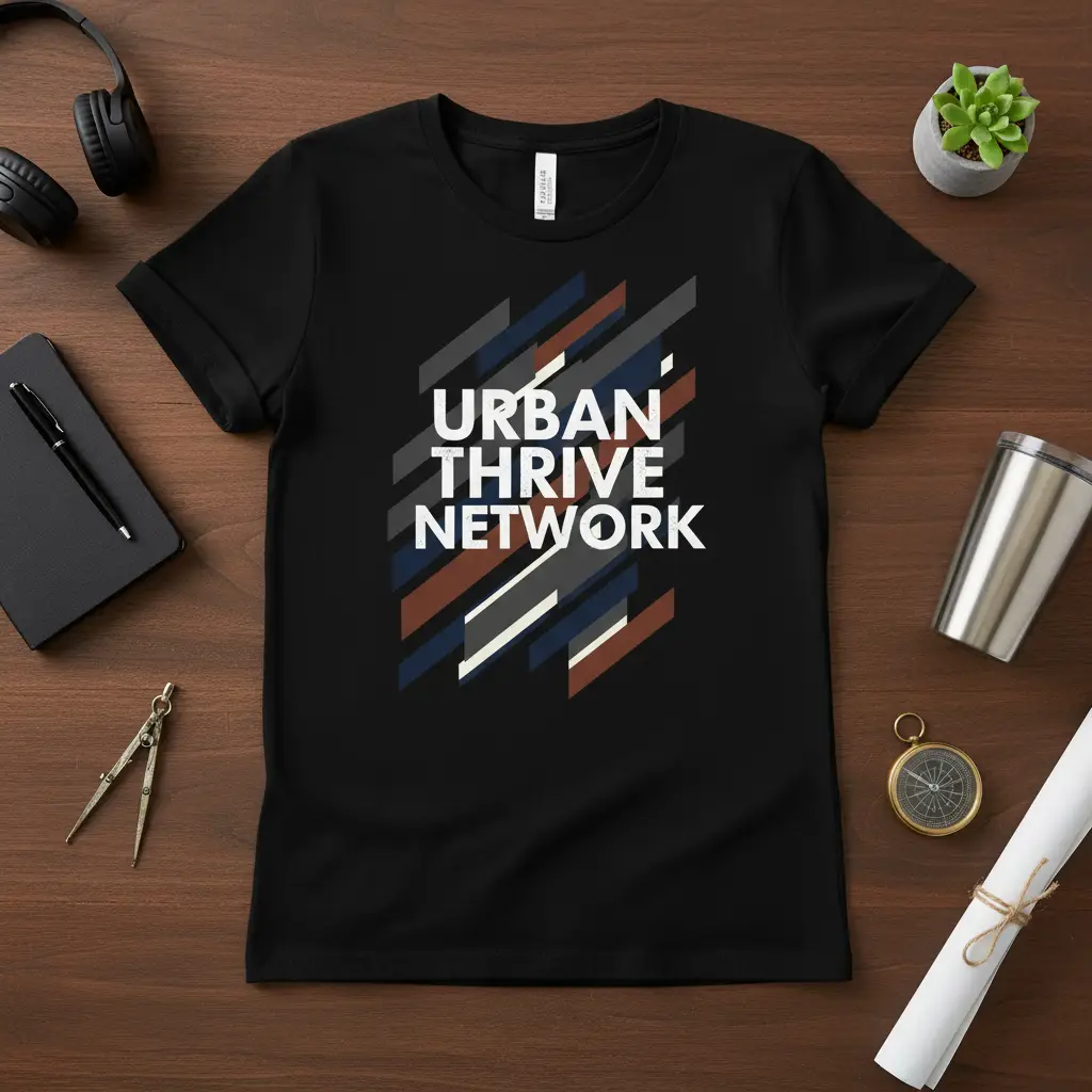 The URBAN THRIVE NETWORK design embodies the spirit of collaboration and forward momentum. Its clean, modern aesthetic, featuring bold white typography against a classic black backdrop, is enhanced by abstract geometric lines in sophisticated shades of grey, navy, and rust. This visual appeal makes it a versatile addition to any wardrobe, suitable for casual meetups or networking events where you want to make a subtle yet impactful statement.