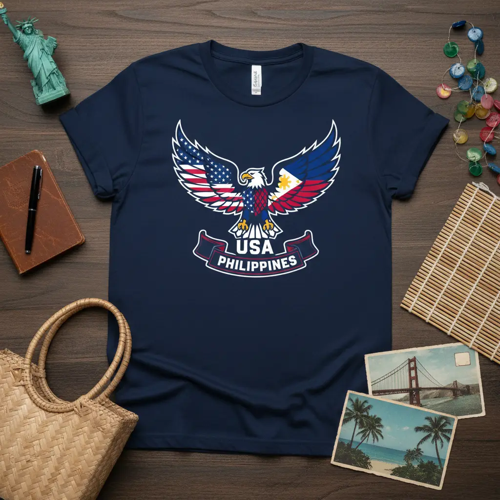 This t-shirt is more than just a piece of clothing; it’s a symbol of connection and a testament to the rich cultural exchange between the United States and the Philippines. The eagle, a symbol of strength and freedom in American culture, is presented here in harmony with the national symbols of the Philippines, representing a proud and unified identity. It’s an ideal way for Filipino Americans, or anyone with a connection to both countries, to celebrate their unique background and heritage.