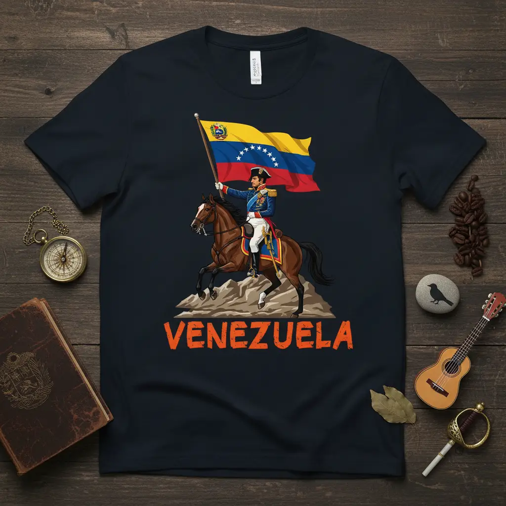 Venezuela T-Shirt designs are more than just apparel; they are a vibrant declaration of heritage and pride. This striking graphic tee features a commanding image of a historical figure on horseback, proudly waving the national flag. Below the equestrian scene, the word “VENEZUELA” is boldly displayed in a distressed, impactful font, ensuring your connection to this beautiful South American nation is unmistakable. It’s an ideal piece for anyone looking to express their roots, celebrate national holidays, or simply share their love for Venezuela with the world. This shirt serves as a wearable tribute to the country’s rich history and resilient spirit.
