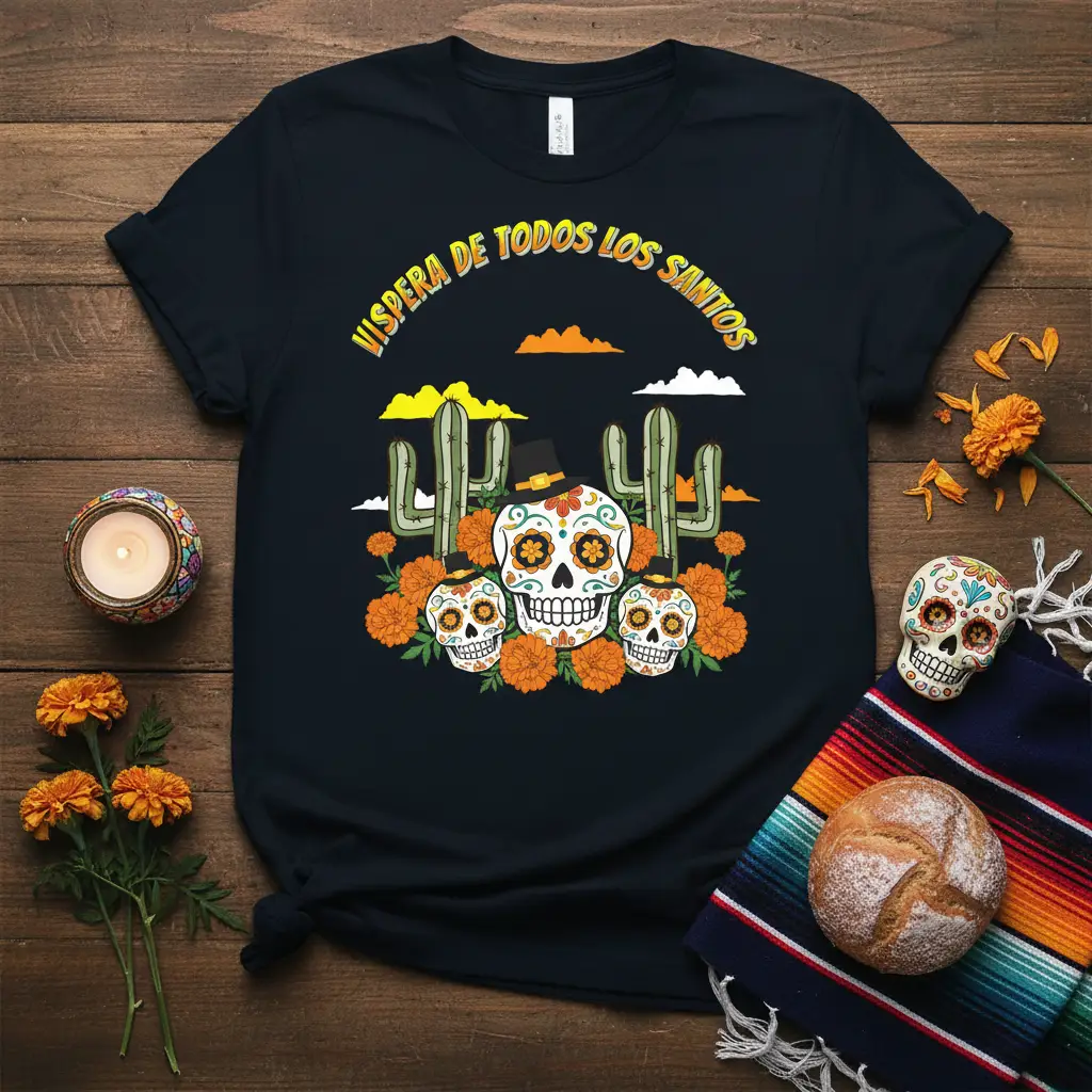 Vispera de Todos los Santos comes to life on this striking t-shirt, offering a vibrant and culturally rich design perfect for celebrating the Day of the Dead. This unique garment features an artistic interpretation of traditional sugar skulls, surrounded by symbolic marigolds and iconic desert cacti, capturing the essence of this significant cultural observance. It’s an ideal choice for anyone looking to express their appreciation for Mexican heritage or embrace the festive spirit of the season with a touch of artistic flair and respect for tradition. The intricate details and bold colors make this tee a standout piece for any wardrobe.