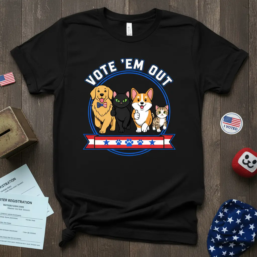 Wearing the “Vote ‘Em Out” tee is a fantastic way to show your enthusiasm for democracy and your love for animals simultaneously. The design is printed on high-quality fabric, ensuring it feels as good as it looks. It’s the perfect garment for any occasion where you want to showcase your political spirit and your affection for dogs and cats. This shirt is designed to be durable and comfortable for everyday wear, making it a go-to item during election cycles and beyond.