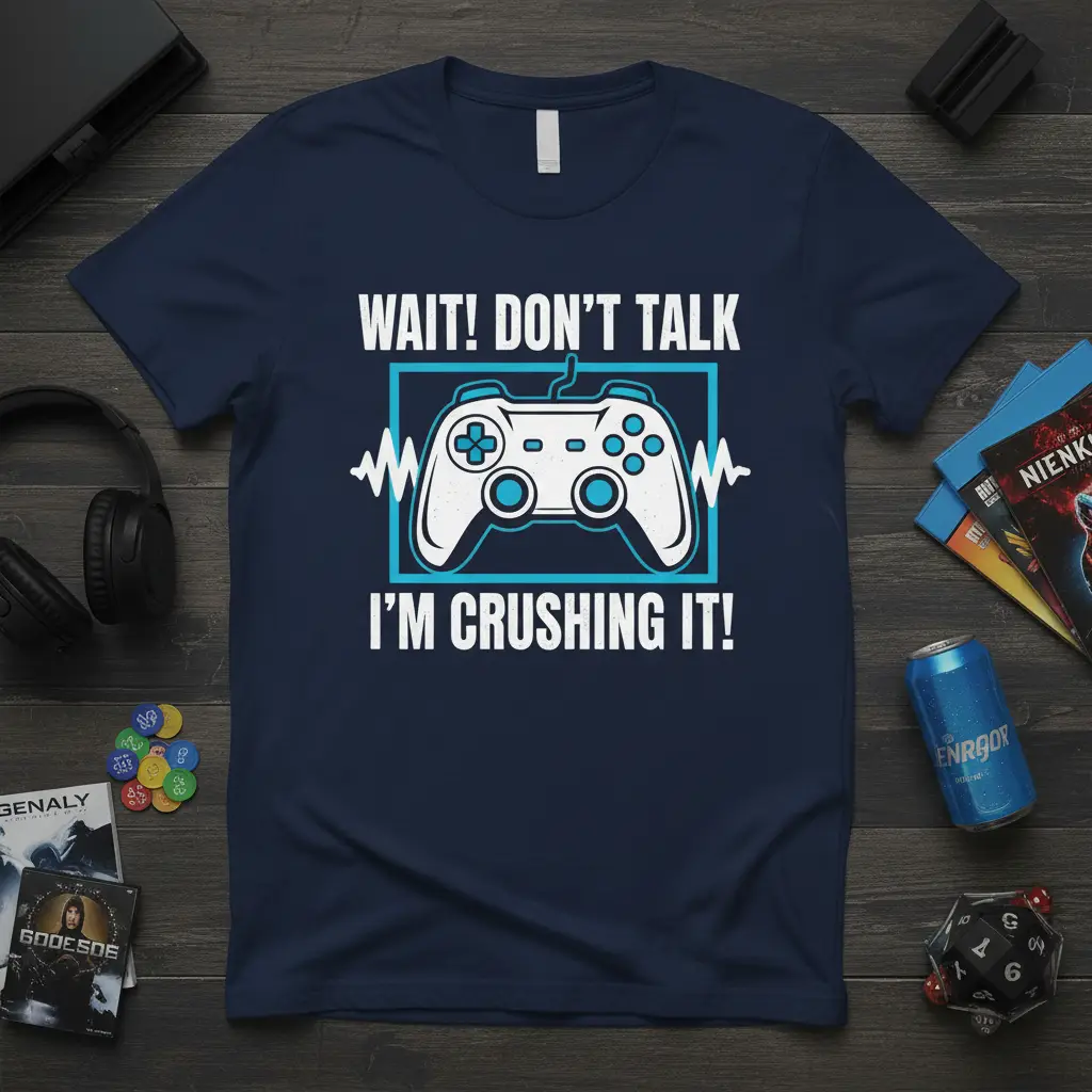 WAIT! DON’T TALK I’M CRUSHING IT! This t-shirt is designed for the dedicated gamer who understands the intense focus required to achieve victory. It captures that perfect moment when you’re in the zone, dominating your opponents and refusing to be interrupted. The bold design speaks volumes, letting everyone know you’re not to be bothered when you’re on a winning streak. It’s more than just apparel; it’s a statement of your gaming passion and skill. Wear it proudly during your next marathon gaming session or to your favorite esports event.