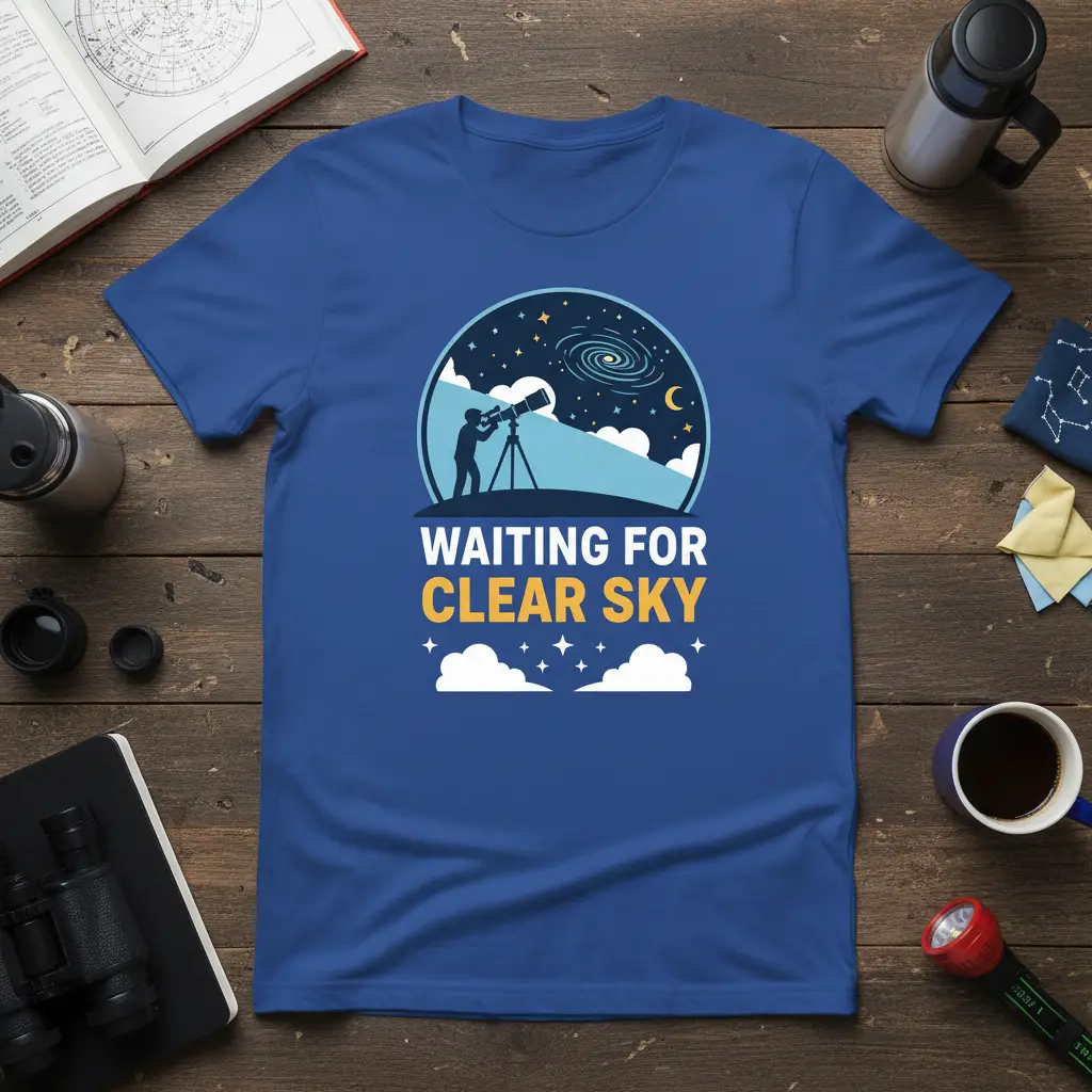 This “Waiting For Clear Sky” t-shirt is the ultimate way to express your fascination with the cosmos. Its unique design and comfortable fit make it perfect for any occasion, from casual meetups to dedicated stargazing nights. Don’t miss out on this opportunity to own a piece that truly speaks to your inner astronomer. Order yours today and be ready for the next clear sky!