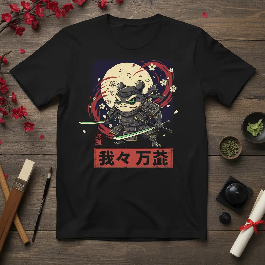 The artwork is rendered with a distinct Japanese art style, incorporating elements like a stylized moon and delicate cherry blossoms. These traditional motifs add depth and context to the design, grounding the fierce frog warrior in a rich cultural landscape. The contrast between the cute amphibian and the formidable warrior persona creates a compelling and memorable visual that is sure to turn heads.