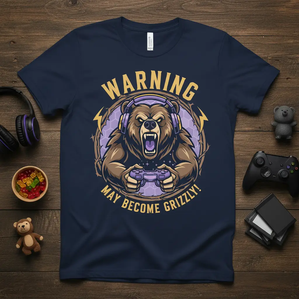 The “Warning May Become Grizzly!” slogan is a relatable sentiment for anyone who has experienced the thrilling immersion of gaming. Whether you’re battling dragons, strategizing in an RTS, or dominating in an FPS, this shirt announces your commitment to the virtual battlefield. It’s designed to be a conversation starter among fellow gamers and a clear signal to others about your gaming dedication.