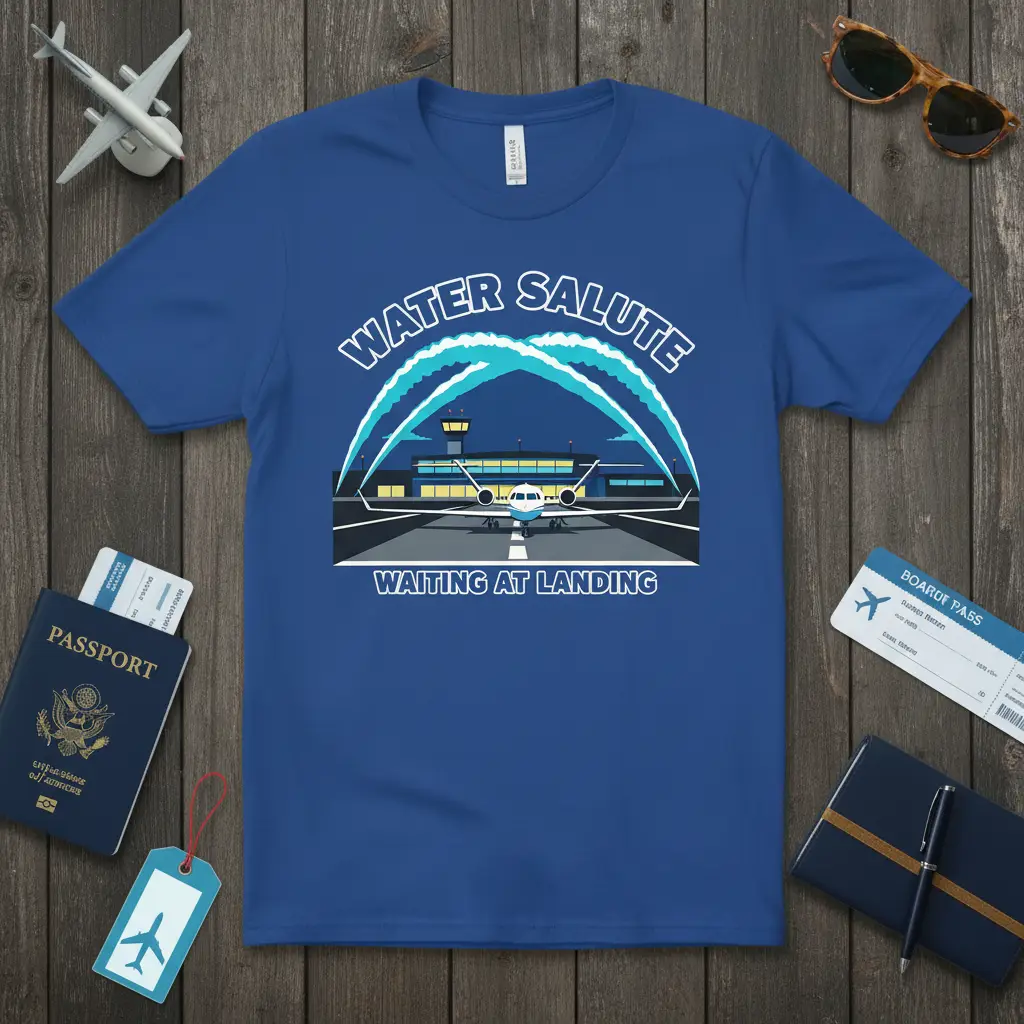 This t-shirt proudly displays the phrase “Water Salute Waiting at Landing,” bringing to life a spectacular airport scene. The graphic depicts a sleek airplane positioned on the runway, ready to receive its ceremonial water cannon salute. The vibrant blue arches of water create a dynamic visual, symbolizing a grand welcome and a safe arrival.