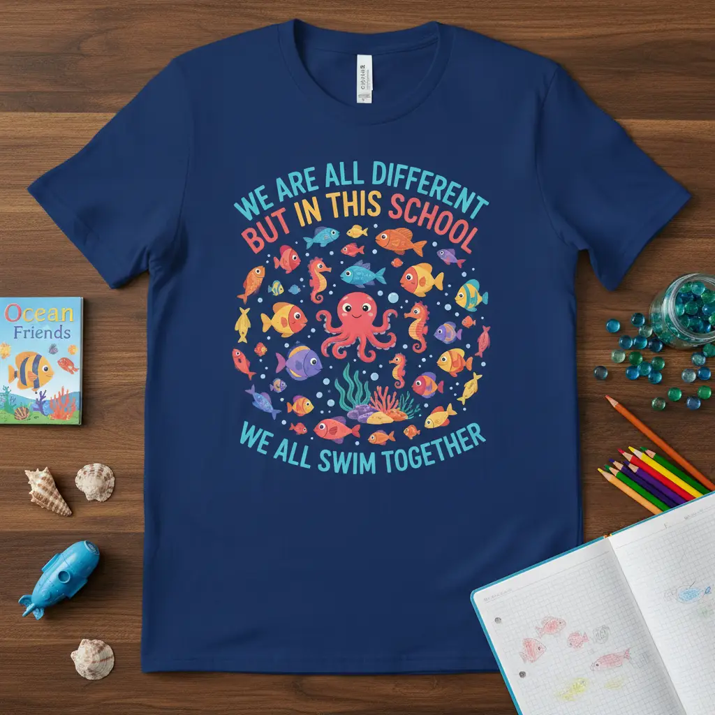 This tee is a perfect symbol for back-to-school events, teacher appreciation weeks, or as a general expression of school spirit. It’s designed to spark conversations about acceptance and understanding, reinforcing the idea that differences should be celebrated, not feared. The visual appeal of the sea creatures adds a fun and engaging element, making the message accessible and enjoyable for all ages.