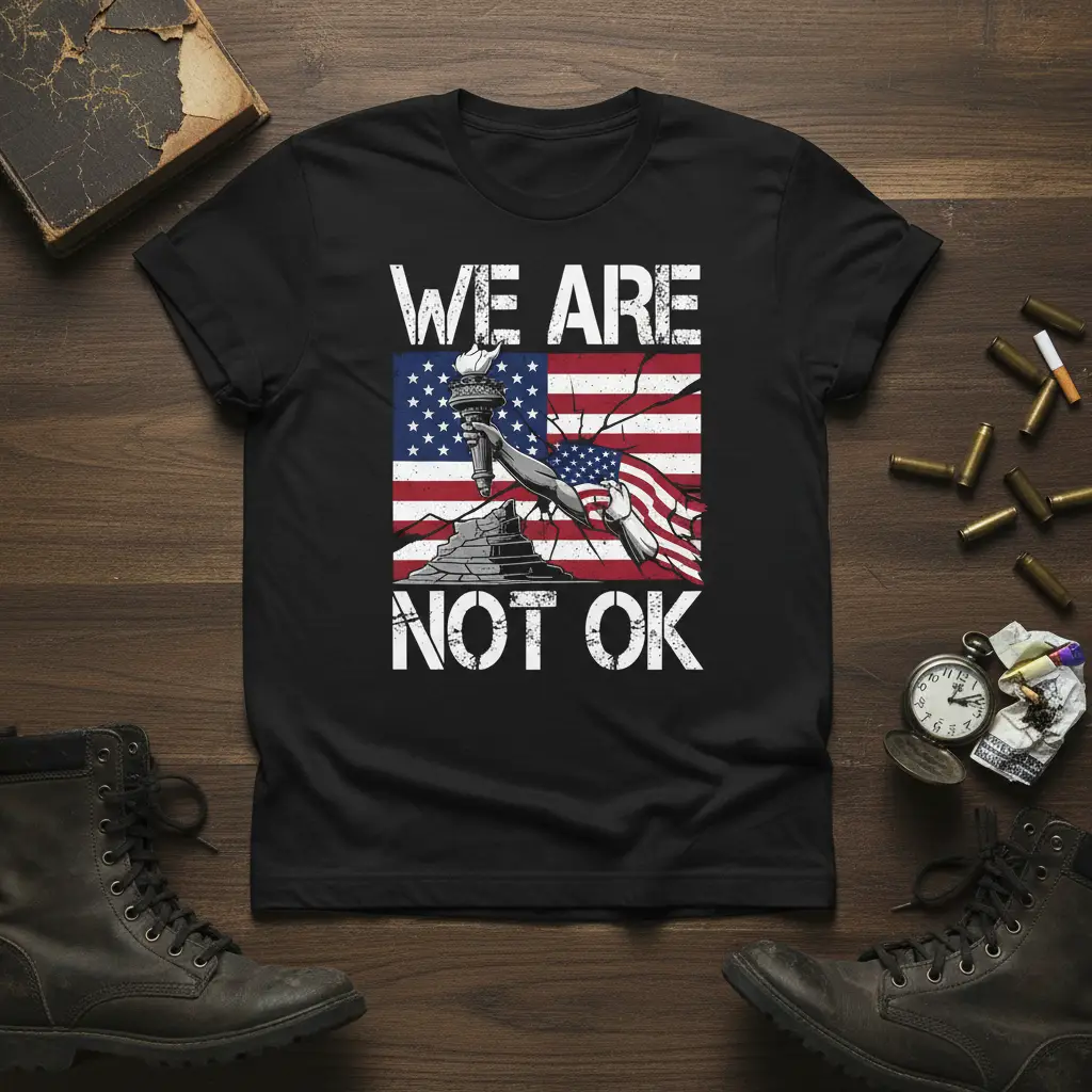 This design captures a profound sense of unease and calls for attention to critical issues facing the nation. The distressed American flag symbolizes the challenges and complexities of the current times, while the Statue of Liberty stands as a reminder of the ideals we strive for. The bold white lettering, “WE ARE NOT OK,” leaves no room for ambiguity, making a clear and resonant statement.